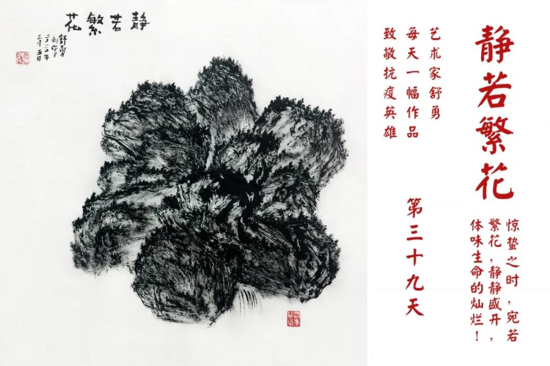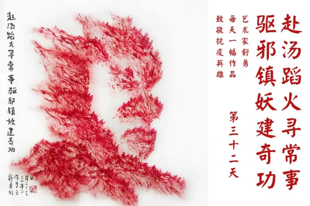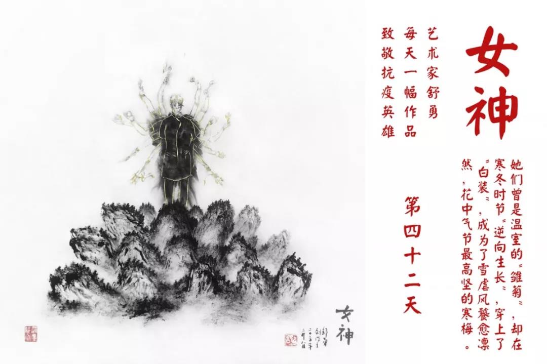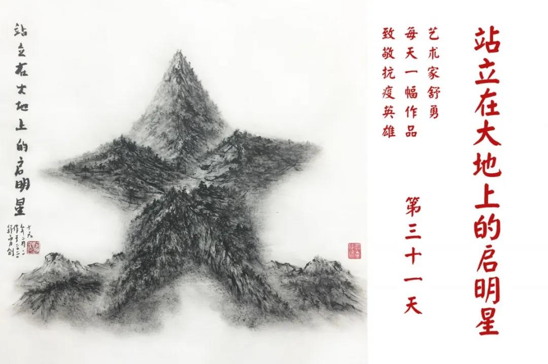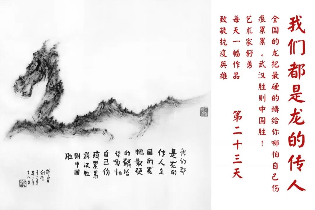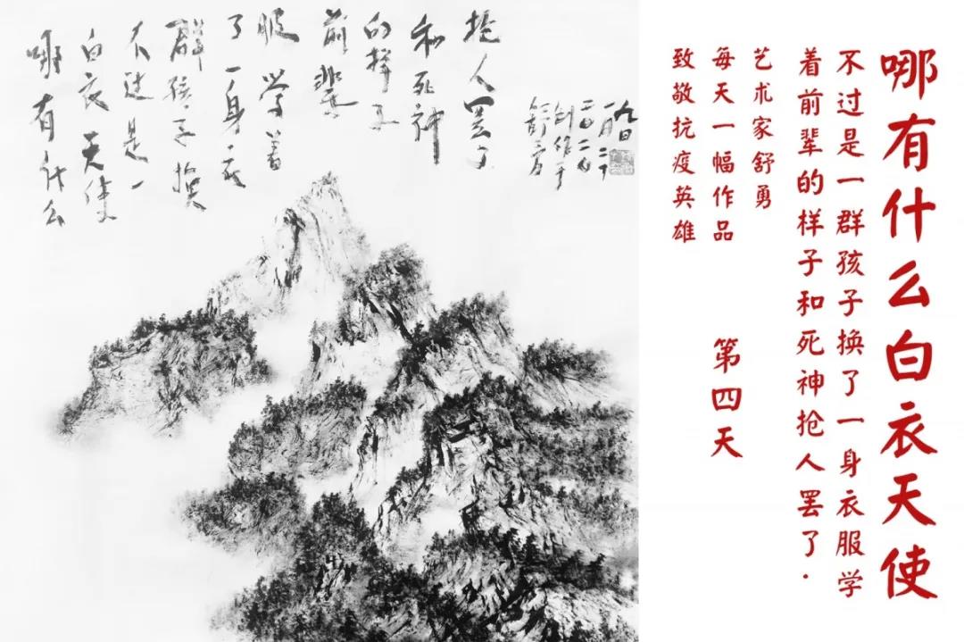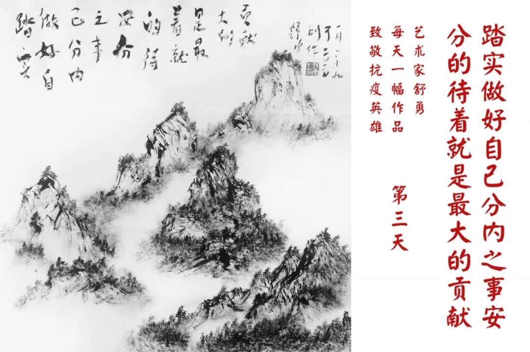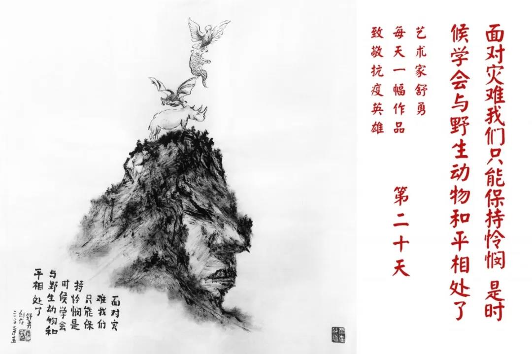 群山,握紧着拳头在呐喊;峻岭,变成了一条腾飞的巨龙;巨峰,托起了一个吹号的先锋;碧嶂,合拢出一朵铿锵的英雄之花……随着疫情的进展,艺术家舒勇始终以山为题材,每天创作一幅不同主题的作品向战斗在医疗战线的英雄们致敬,迄今已创作了43幅。北京南站还将他创作的这批“致敬抗疫英雄”作品做成公益广告,在上百个动态屏幕滚动播放。据称,他的致敬行动要持续到疫情结束,并最终将作品全部捐赠出去。他说:这个行动与战斗在第一线的医护人员相比,显得单薄与微不足道。但是从自己的角度来审视,在这种微不足道的坚持中,让我找到了一个文艺工作者的历史使命与担当。