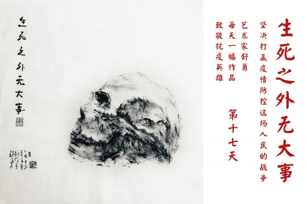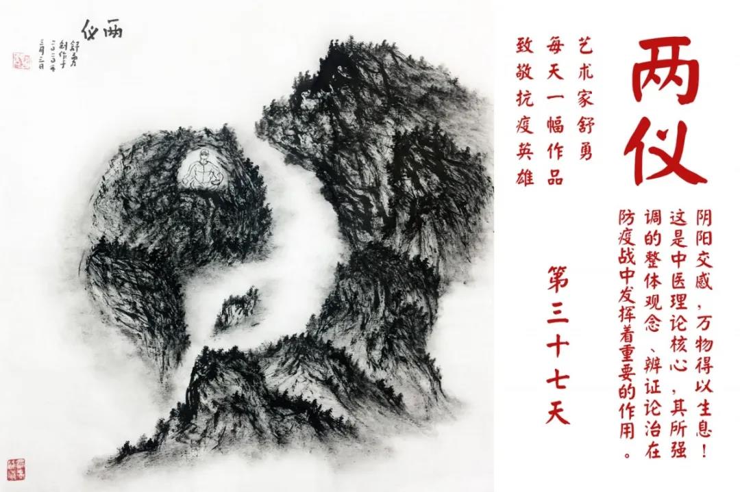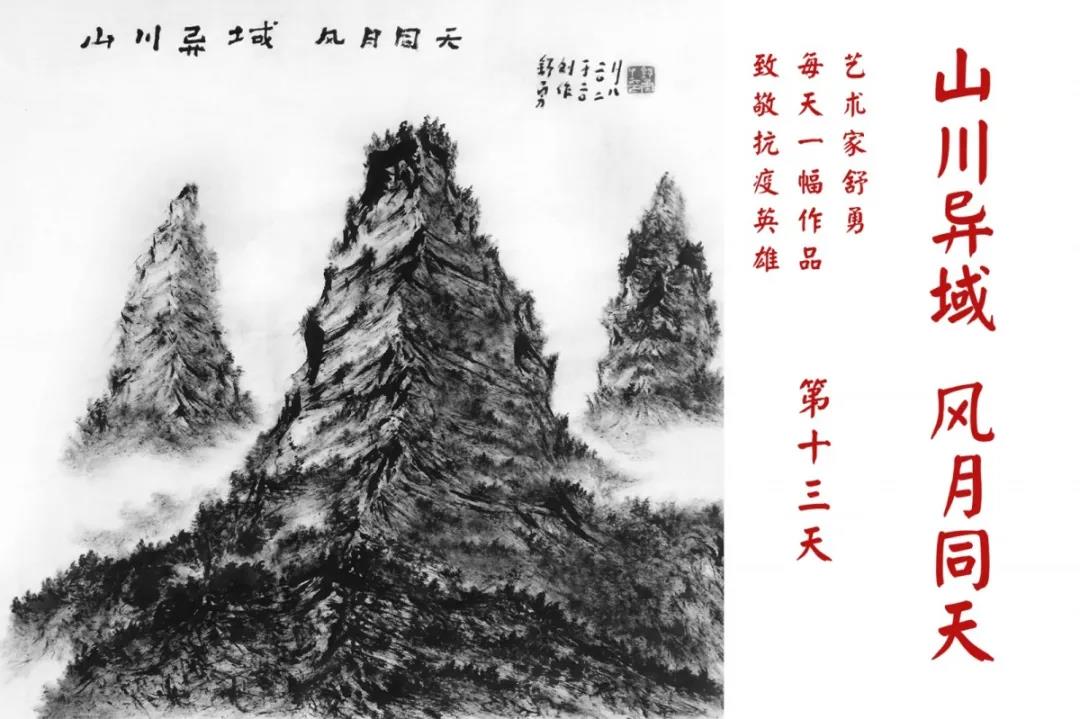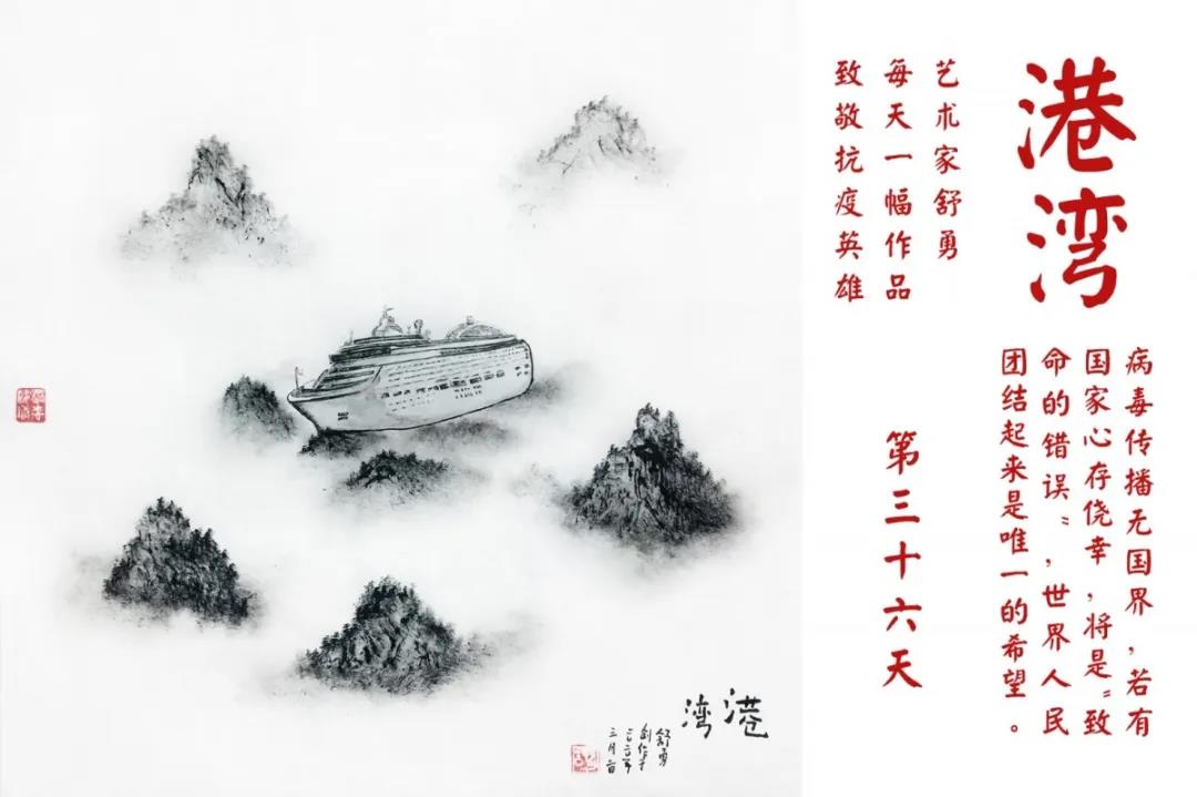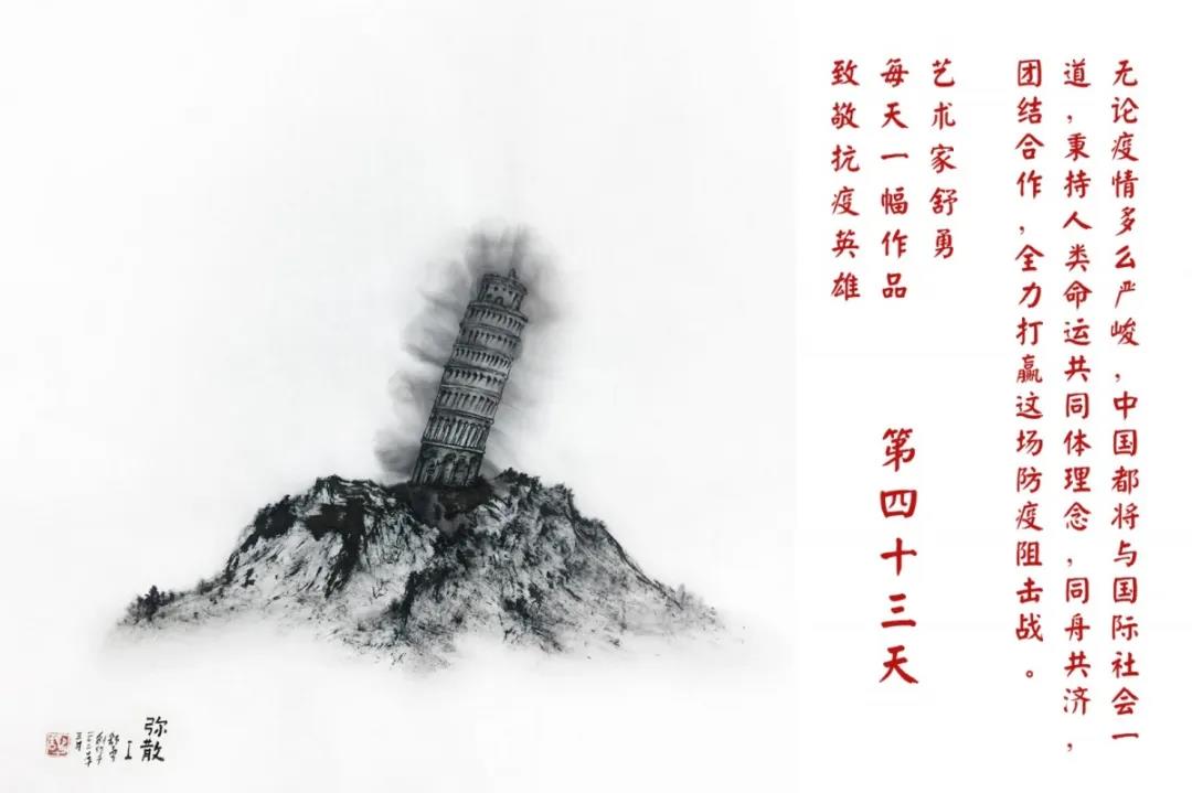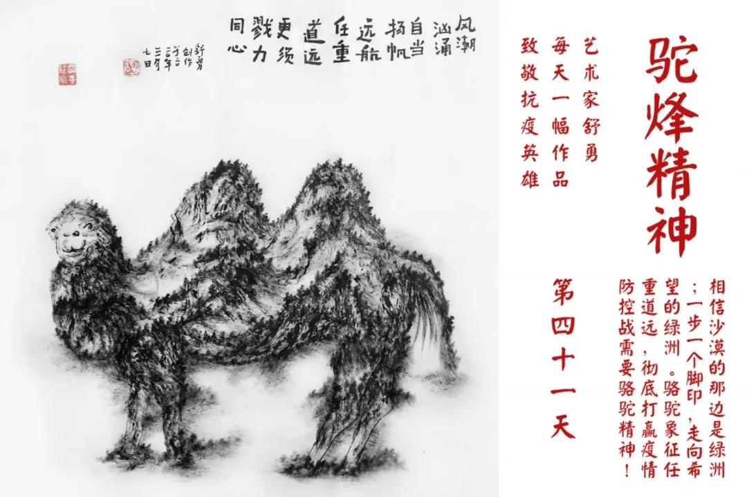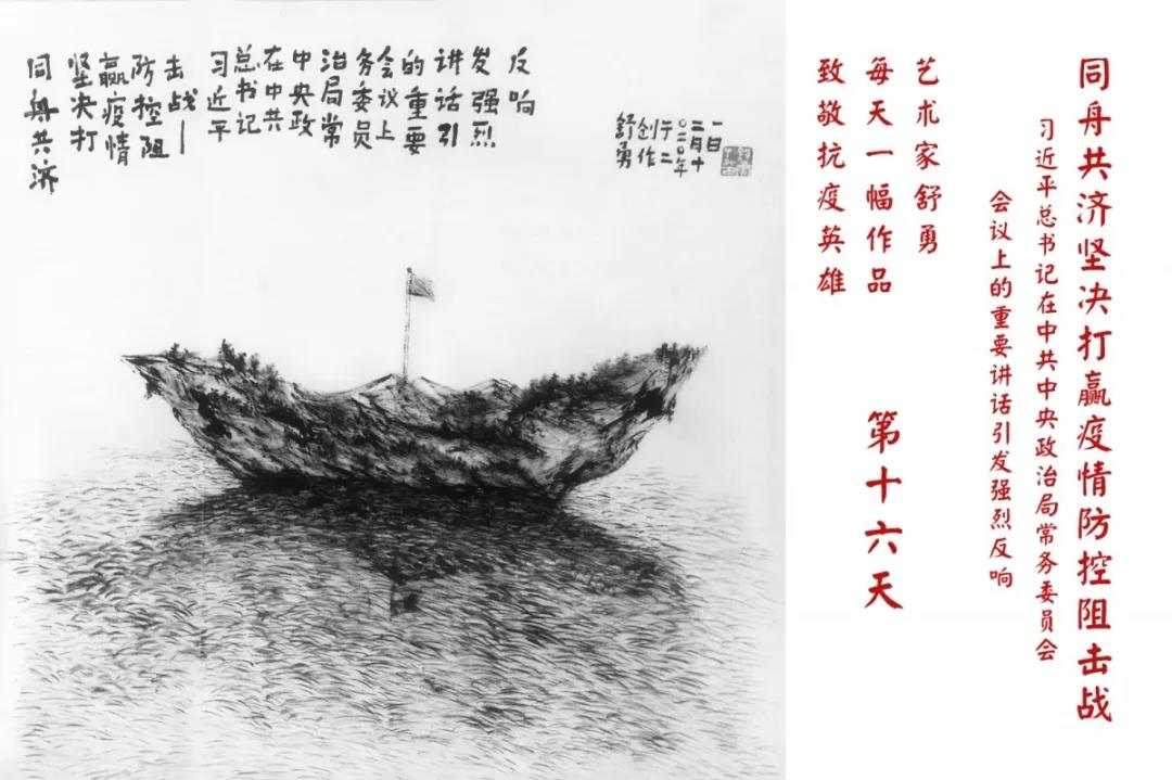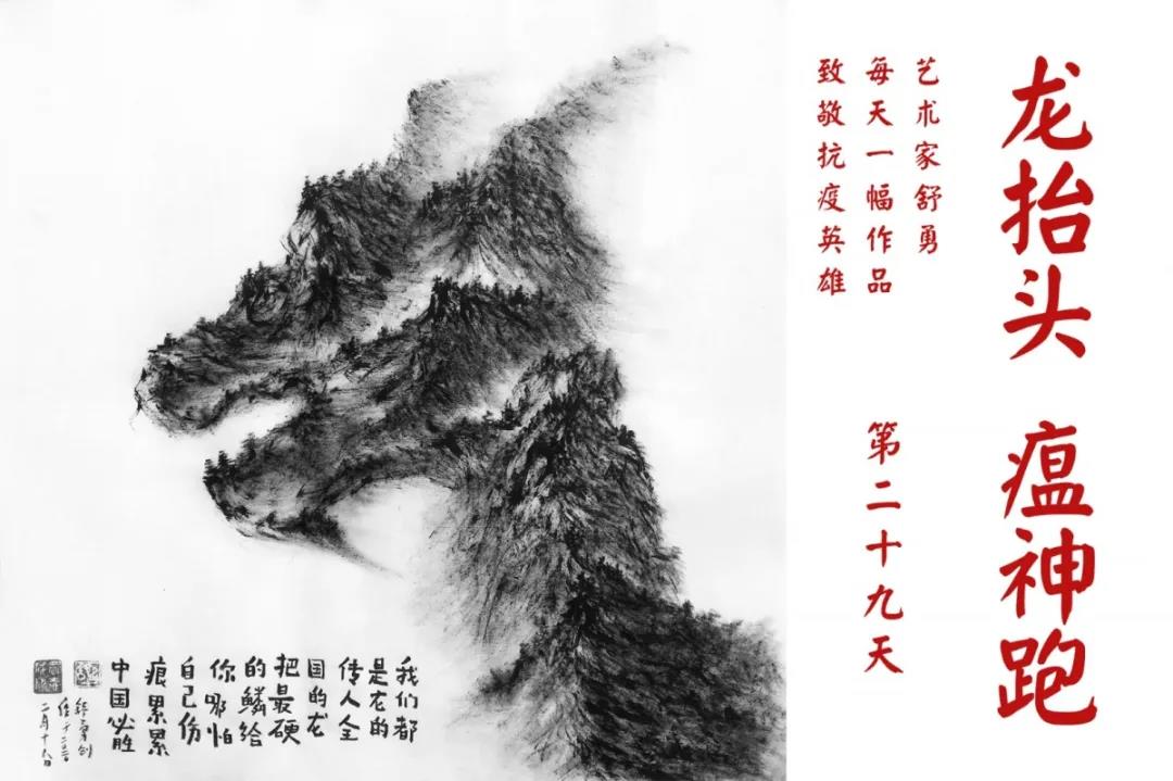 群山,握紧着拳头在呐喊;峻岭,变成了一条腾飞的巨龙;巨峰,托起了一个吹号的先锋;碧嶂,合拢出一朵铿锵的英雄之花……随着疫情的进展,艺术家舒勇始终以山为题材,每天创作一幅不同主题的作品向战斗在医疗战线的英雄们致敬,迄今已创作了43幅。北京南站还将他创作的这批“致敬抗疫英雄”作品做成公益广告,在上百个动态屏幕滚动播放。据称,他的致敬行动要持续到疫情结束,并最终将作品全部捐赠出去。他说:这个行动与战斗在第一线的医护人员相比,显得单薄与微不足道。但是从自己的角度来审视,在这种微不足道的坚持中,让我找到了一个文艺工作者的历史使命与担当。
