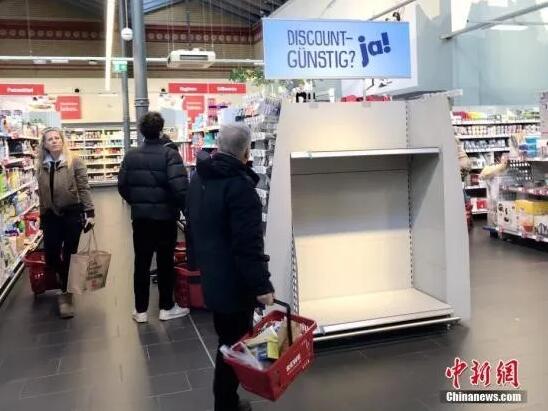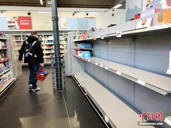 当地时间3月12日,德国柏林市中心一家大型超市,一名顾客经过被抢购一空的厕纸货架。(中新社记者彭大伟摄)