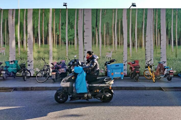 隔离时期,外卖小哥连接起居民和外卖美食。(虞向军摄)