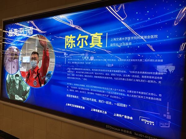近日,上海各大地铁站多了一道特殊的“风景”,这些地铁站的广告灯箱内投放了上海支援武汉医护人员的事迹和照片。