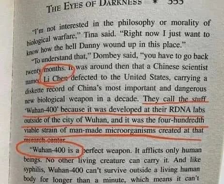 The Eyes of Darkness,《黑暗之眼》,是美国作家迪恩·昆茨1981年出版的虚构小说。其中提到武汉郊区一家病毒实验室研制的生化病毒“武汉-400”泄漏,导致一场大恐慌和大灾难。