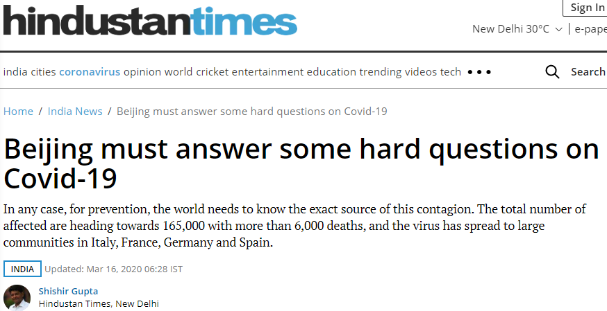 欧吉哈提告的同一天,3月16日,印度斯坦时报刊文,“北京必须回答有关新冠疫情的一些重大问题”: