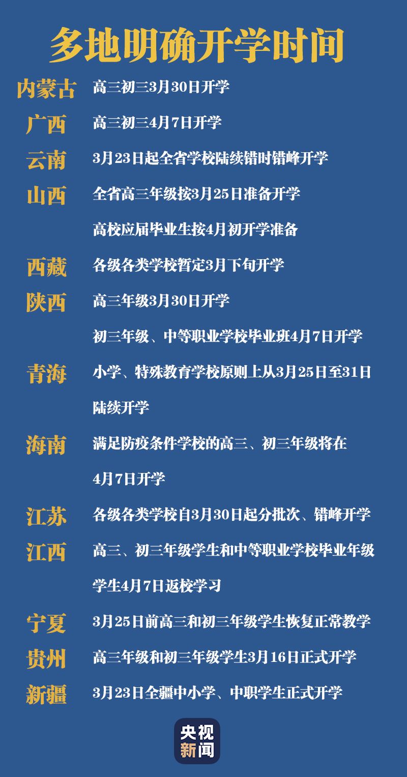 山西:高三年级按3月25日做开学准备;高校应届毕业生按4月初进行开学准备。