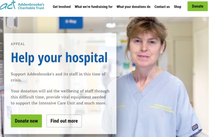 3月18日,剑桥阿登布鲁克慈善基金会(Addenbrooke's Charitable Trust)发起紧急募捐,呼吁民众支持阿登布鲁克医院、Rosie妇产医院和医护人员抗击疫情。皇家帕普沃思慈善机构(The Royal Papworth Charity)也发起募捐活动,呼吁民众在这一艰难时刻为医护人员捐款捐物。