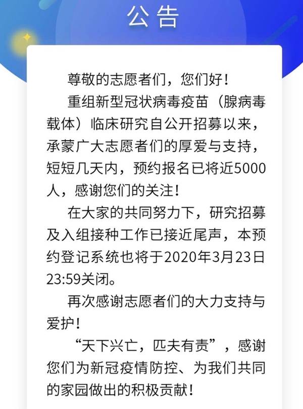 25日上午,新京报记者在中国临床试验注册中心预约报名系统看到,该系统已暂停预约报名服务并发布公告。公告显示,短短几天内预约报名已将近5000人,研究招募及入组接种工作已接近尾声,预约登记系统已经于3月23日23:59关闭。