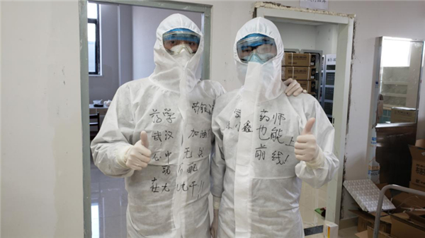 他们在自己防护服上写下“药师也能上‘前线’”,以此为自己打气加油。