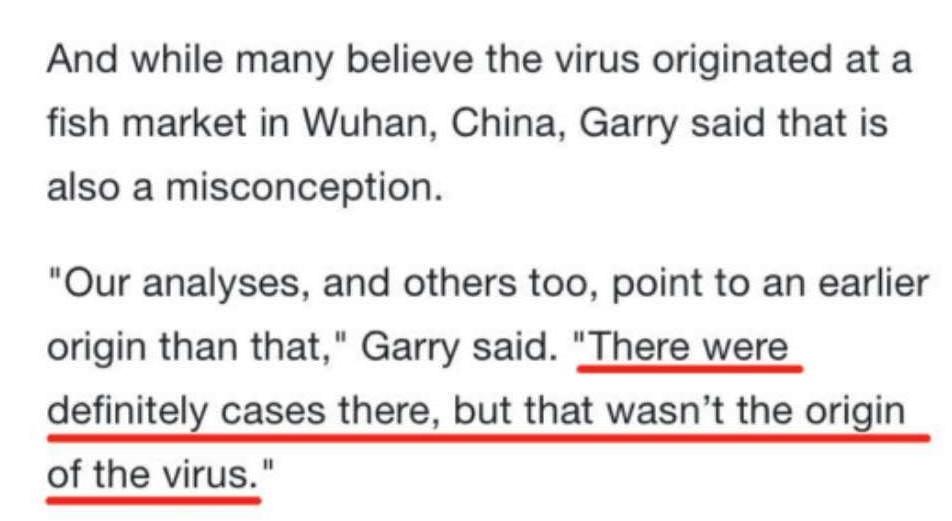 3月27日,美国广播公司(ABC)报道了对罗伯特·加里的采访。在这个采访中,加里说了一条关键信息:尽管有人认为病毒起源于武汉一家海鲜市场,但他认为这是错误的,“我们的分析、还有一些科学家的分析,都指向了比武汉一家海鲜市场更早的起源,”加里说,“那儿确实有一些病例,但那里不是病毒的起源。”(There were definitely cases there, but thatwasn’t the origin of the virus)联系上下文来看,这里的 there 和that指的是武汉海鲜市场(即华南海鲜市场)。
