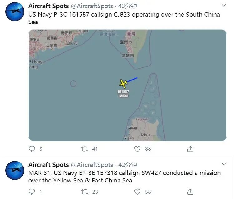 3月31日,据长期追踪美国军机动向的社交帐户Aircraft Spots发布的消息显示,一架编号为161587的美国海军P-3C巡逻机在南海海域上空飞行,同一天,还有一架编号为157318的EP-3E电子侦察机在中国东海和黄海海域飞行。美国军机在一天之内同时进入南海、东海和黄海上空的情况并不多见。
