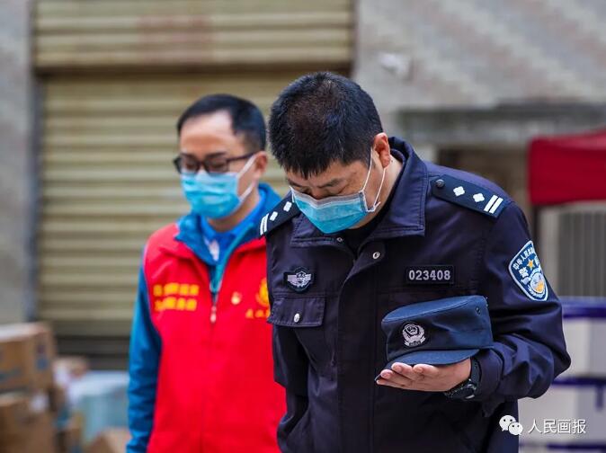 4月4日上午10时,武汉市东湖新城社区民警肃穆站立,默哀三分钟,悼念抗击疫情牺牲烈士和逝世同胞。