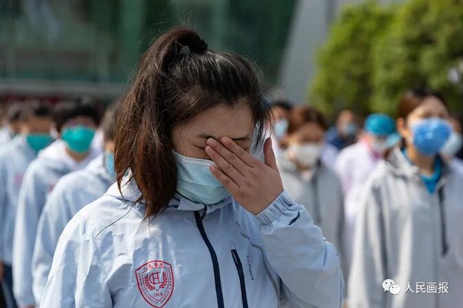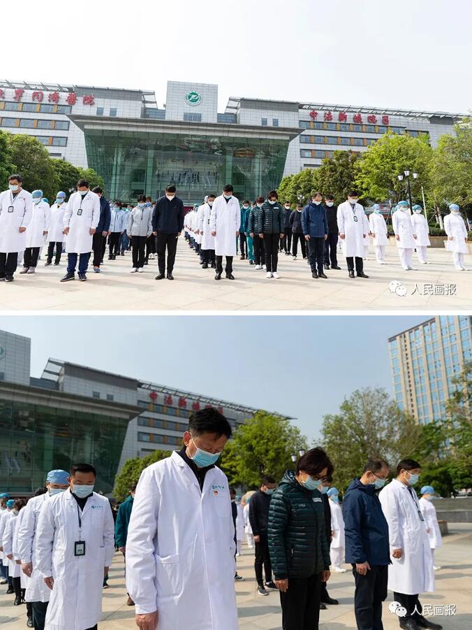 在华中科技大学同济医学院附属同济医院中法新城院区,本院部分医护人员及北京大学第一医院、北京大学人民医院、北京大学第三医院、北京医院、北京协和医院的部分援鄂医疗队员参加默哀,向抗击新冠肺炎疫情斗争牺牲烈士和逝世同胞表示深切哀悼。