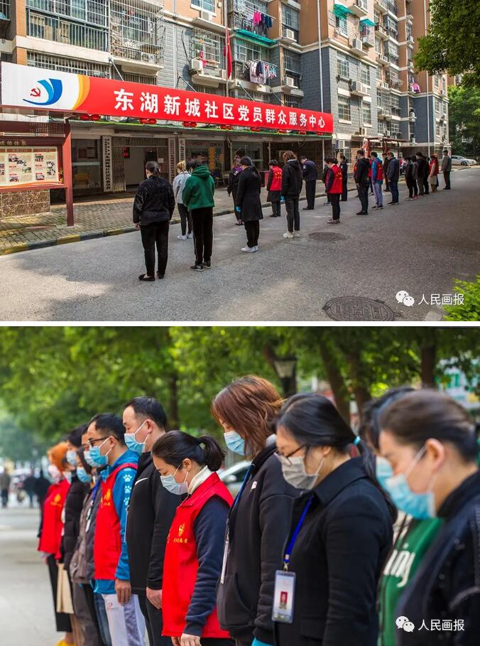 4月4日上午10时,武汉市东湖新城社区工作人员肃穆站立,默哀三分钟,悼念抗击疫情牺牲烈士和逝世同胞。