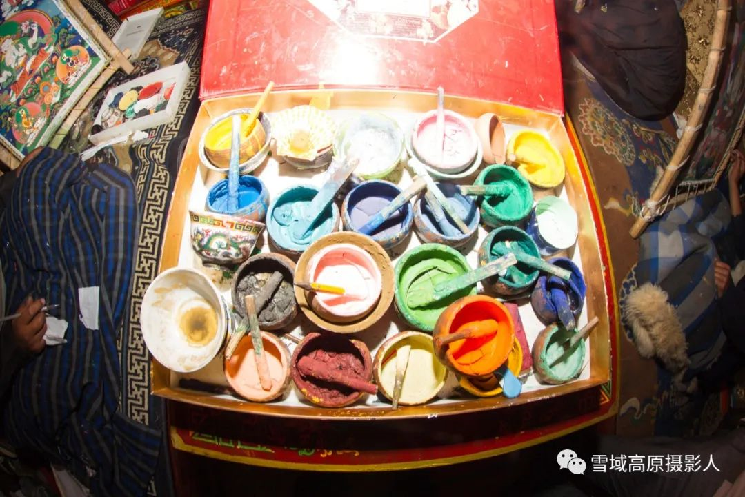 而一部唐卡制作的非常复杂,从开始到绘制完成要费上几个月功夫。特别是有名望的画师要求严谨,做到一丝不拘。听说唐卡画技为几种派别,而勉唐派的传统唐卡绘画技术最精至,色泽亮丽。一直慕想去拜访,后经朋友介绍现著名的勉唐派传统唐卡画师次仁加旺画师,得与见到画师机会,终于如愿以偿,于是利用休息日驱车前往,次仁旺加画师家住在日喀则的萨迦县,经过近7个多小时的路程终于来到次仁大旺加画师家门前,一座漂亮的藏式二层小楼,出来迎接我们的次仁旺加画师和他的夫人,然而另我们没有想到的是次仁旺加画师的家非常简补,作为著名的唐卡绘画大师,西藏美术协会副主席,却是如此的生活简朴没有半点奢华,另人敬佩,次仁旺加画师待人十分真诚友善,我怀着一颗非常恭敬的心情走进屋,在客厅里,触目眼前的是墙上几幅次仁旺加画师的唐卡,一面红色锦旗十分醒目,这时女主递过来一杯酥油茶,一边品茶一边注视着厅正面长长的木柜上,供着几尊佛像,中间是画有释迦牟尼的唐卡,一杯茶下肚心里暖洋洋的,随后次仁旺加画师领我们来到二层一间长形唐卡画室,几位徏弟正在忙着绘画,地上放着一堆顔料。仁次旺加介绍说:这些色彩艳丽的颜料都是矿植物,矿植物颜料作为唐卡最基本的颜料,如珊瑚、玛瑙、青金石、以及藏红花、茜草、大黄等植物颜料具有色彩鲜艳、洁净,可保持千年而不褪色的特点。看着几十种精加工研磨的涂料,光这一项活就很费工夫。