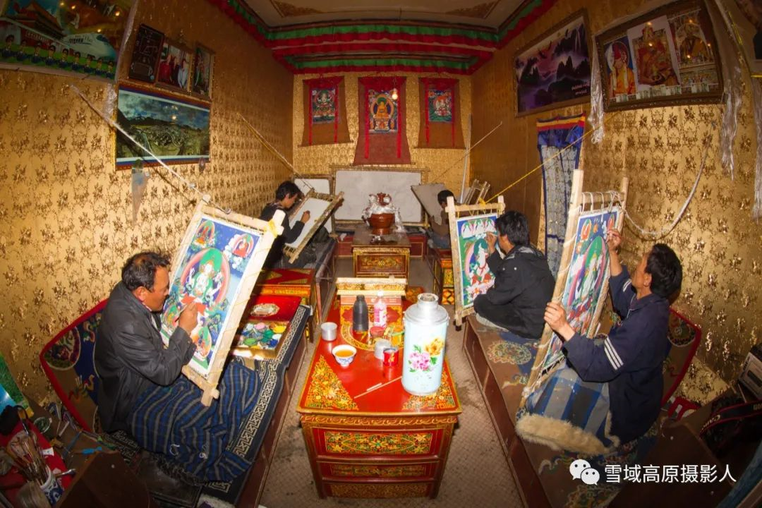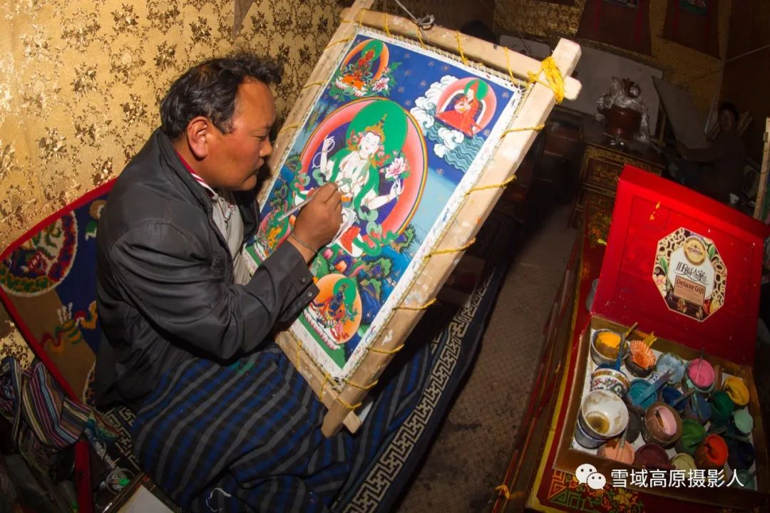 ー幅唐卡的绘制过程是一次积累善业功德和对佛法崇拜的行为。看着眼前挂满画室的唐卡,我惊叹于画师如此神功的画技,唐卡上的佛祖经精雕细绘,如神灵再现唯妙唯肖,其气势恢宏、功笔细腻、色彩斑斓这里面凝结了多少画师的辛苦劳作,他们是在用一颗执着真诚向佛的心在画,滴滴汗水凝聚着对佛教的无比虔诚。西藏唐卡流派众多,主要以勉唐派、钦泽派、噶玛嘎孜派三大画派为代表,特别是勉唐派造像法度精严,尤其注重线条的运用,线条工整流畅,色调活泼鲜亮,变化丰富。在背景处理上加进了带有地方特色的风景和花卉纹饰,浅淡施色加金线勾勒,富丽多姿,呈现出更为纯粹的本土画风,民族特色十分强烈。唐卡是藏族文化中独具特色的绘画艺术形式,唐卡上的历史事件、人物传记、宗教教义、西藏风土、民间传说、神话故事等,涉及政治、经济、历史、宗教、文艺、社会生活各个方面,堪称藏民族形象的百科全书。