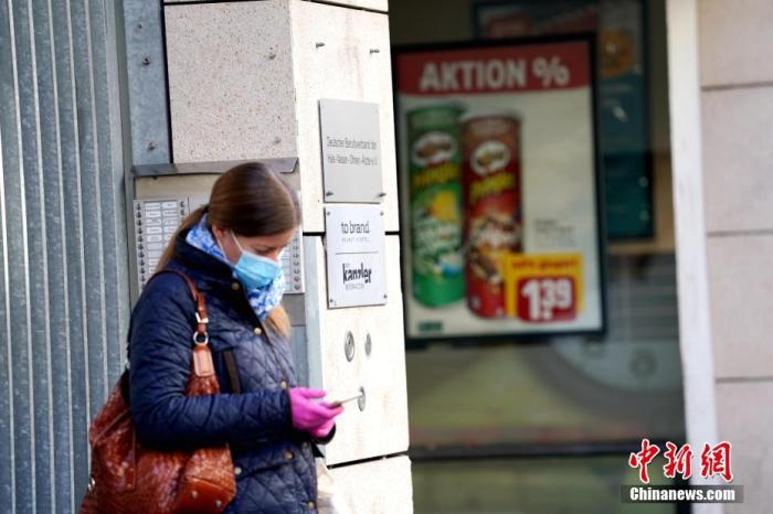 4月20日下午,一位戴口罩和手套的女子站在柏林一家超市门前。近日来,柏林佩戴口罩者逐渐增多。 中新社记者 彭大伟 摄