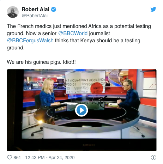 “之前,法国医生把非洲看作预备疫苗试验场,现在资深BBC记者弗格斯·沃尔什又认为肯尼亚应该成为疫苗试验场。我们都成了他眼中的豚鼠。蠢货!”↓