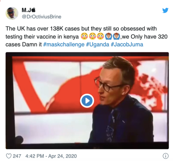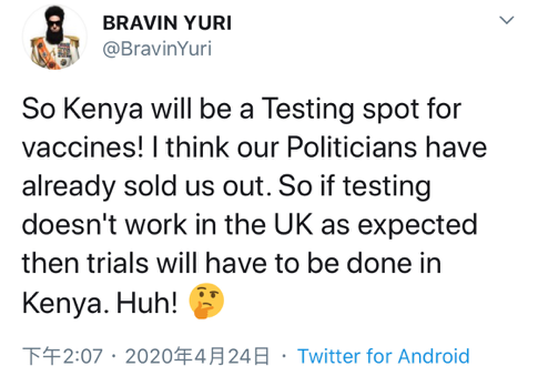 “英国自己的确诊人数已经超过13.8万了,然而他们还想着来肯尼亚做疫苗试验,我们这里可只有320例确诊呀。”↓