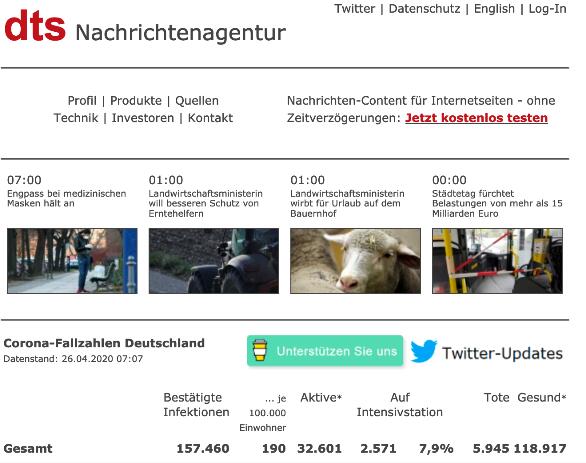 根据德国DTS通讯社实时统计数据,截至当地时间4月26日7时07分,德国已累计报告157460例新冠肺炎确诊病例,较前一天新增1529例。