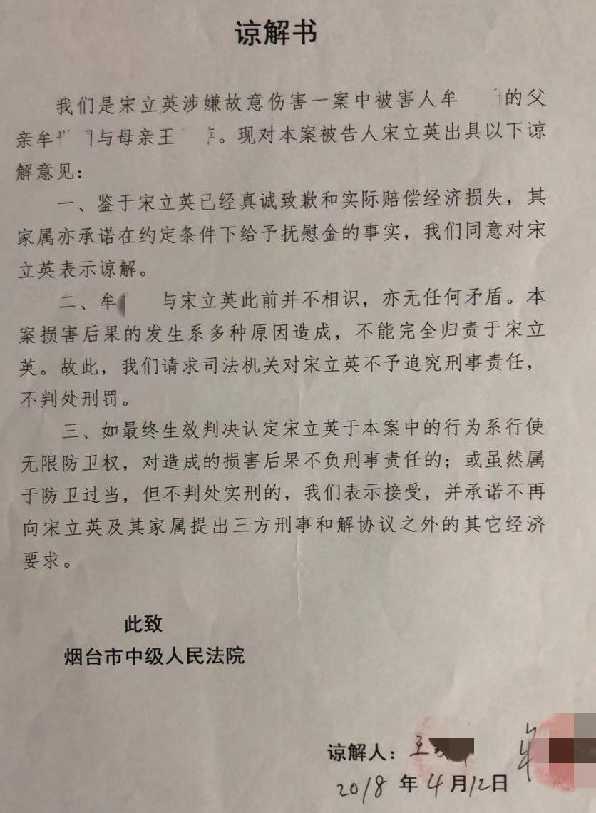 二审开庭前,2018年4月12日,死者牟某某的父母,向宋立英一方出具了“谅解书”。新京报记者掌握的一份谅解书显示,被害人(死者)父母称,鉴于宋立英已经真诚致歉和实际赔偿经济损失,家属亦承诺在约定条件下给予抚慰金的事实,同意对宋立英表示谅解。