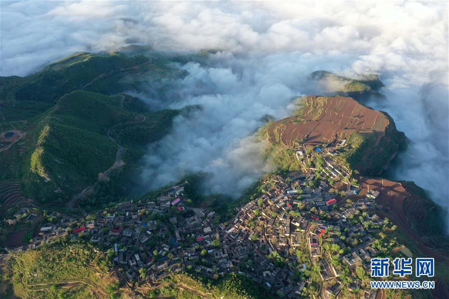 这是5月5日在河北省沙河市刘石岗乡渐凹村拍摄的云海景观(无人机照片)。 5月5日,雨后的河北省沙河市刘石岗乡渐凹村云雾飘渺,村庄、山峦、梯田在云海中若隐若现,构成一幅美丽画卷。 新华社记者 牟宇 摄