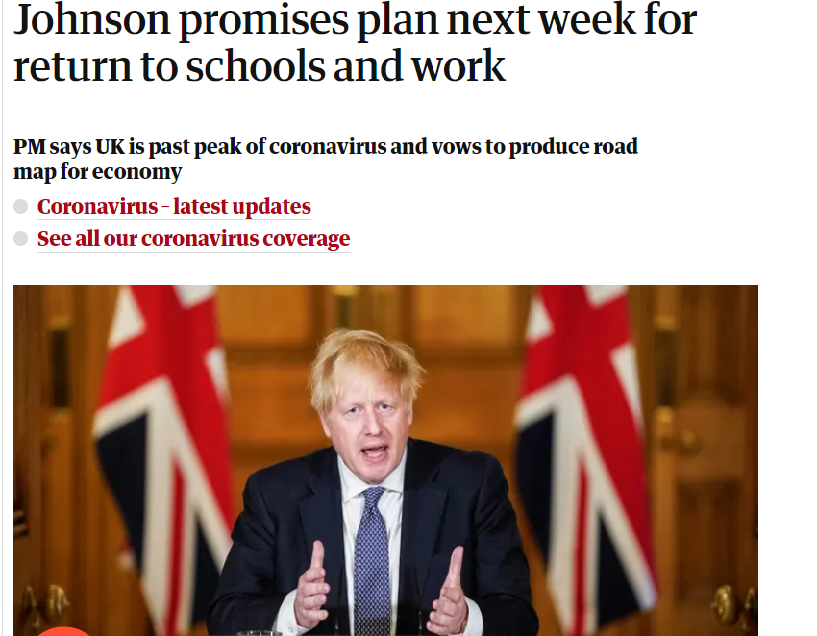 图:4月30日英国《卫报》文章:约翰逊承诺下周计划复学复工的解封措施