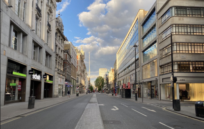 图:5月2日英国伦敦著名商业街牛津街上所有店铺关闭空无一人