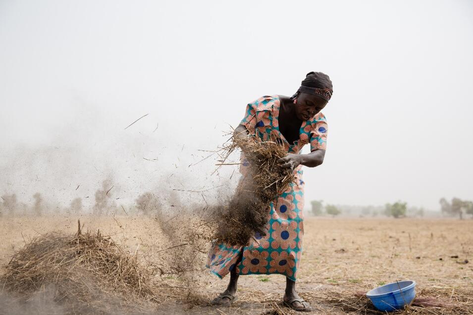 为了贴补收入,丽贝卡在收割完的田间地头收集散落的稻谷。红十字国际委员会供图