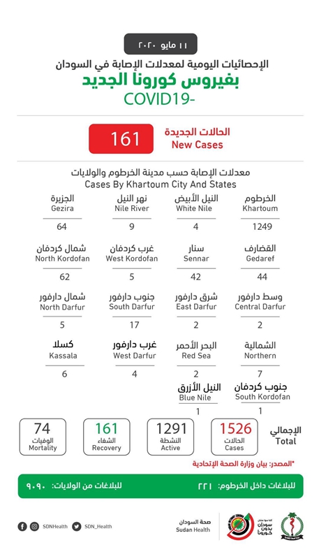 苏丹新增新冠肺炎确诊病例161例 累计确诊1526例