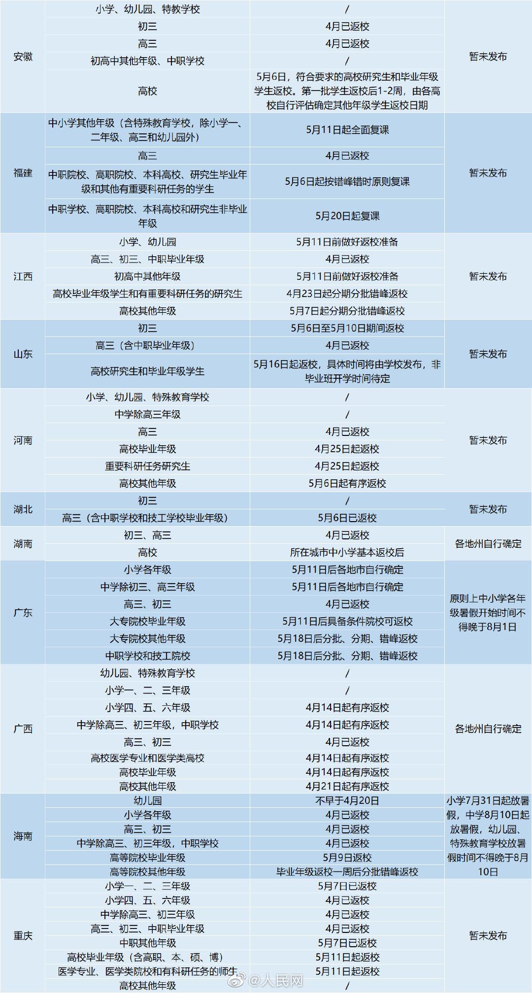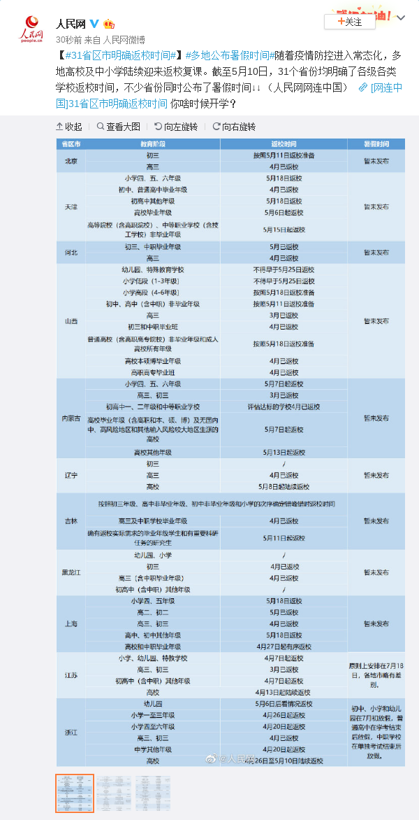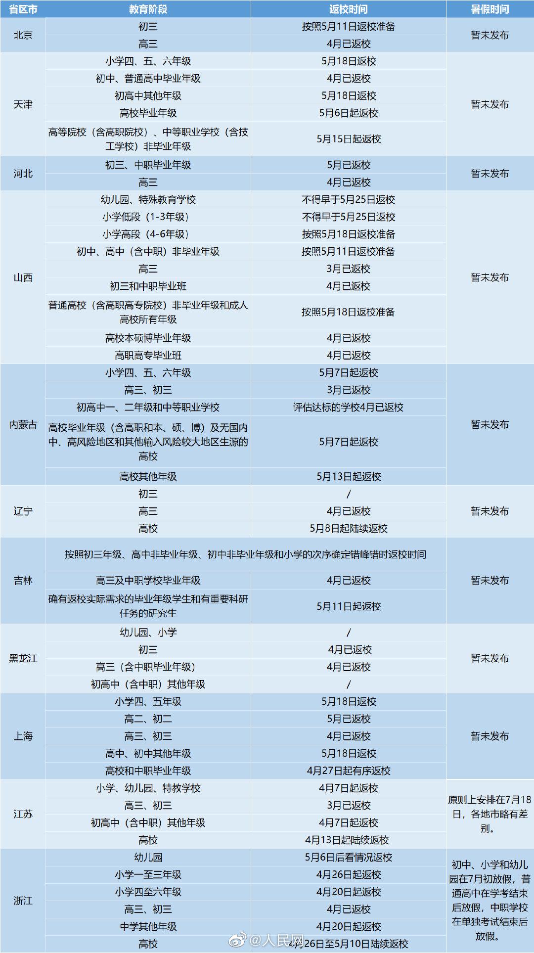随着疫情防控进入常态化,多地高校及中小学陆续迎来返校复课。截至5月10日,31个省份均明确了各级各类学校返校时间,不少省份同时公布了暑假时间。
