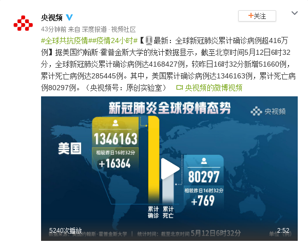 据美国约翰斯·霍普金斯大学的统计数据显示,截至北京时间5月12日6时32分,全球新冠肺炎累计确诊病例达4168427例,较昨日16时32分新增51660例,累计死亡病例达285445例。其中,美国累计确诊病例达1346163例,累计死亡病例80297例。