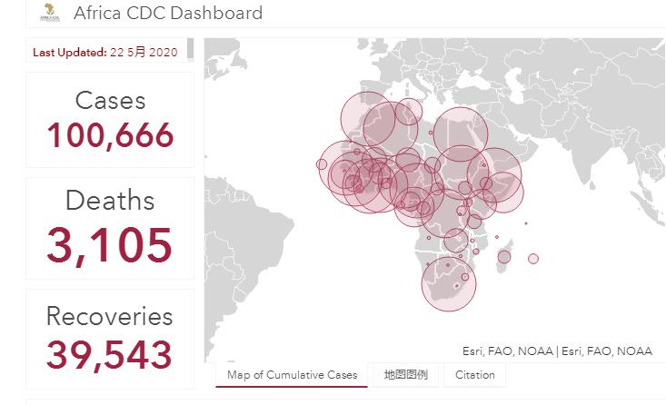据非洲疾控中心公布的实时数据显示:非洲地区54个国家报告了新冠肺炎确诊病例100666例,死亡3105例,39543人康复。