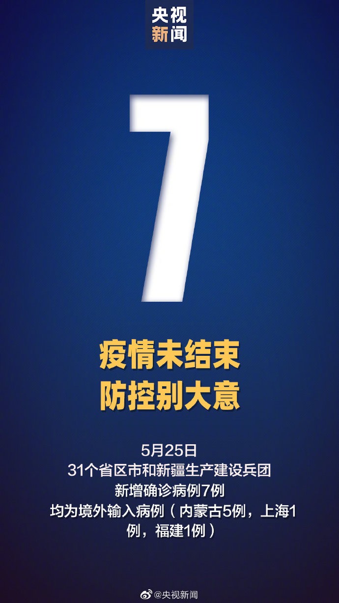 5月25日0—24时,31个省(自治区、直辖市)和新疆生产建设兵团报告新增确诊病例7例,均为境外输入病例(内蒙古5例,上海1例,福建1例);无新增死亡病例;无新增疑似病例。