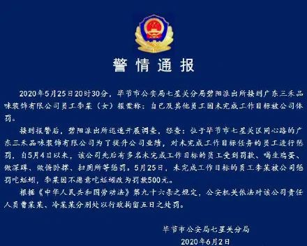 6月2日,贵州省毕节市公安局七星关分局发布通报称,自5月4日以来,贵州毕节某装饰公司先后有多名未完成工作目标的员工受到罚款、喝生鸡蛋、做深蹲、做俯卧撑、扫厕所等惩罚。5月25日,未完成工作目标的员工李某被公司惩罚吃蚯蚓,李某因不愿意吃蚯蚓改为罚款500元,此后李某报案,当地有关部门介入调查。根据相关法律,该公司责任人员曹某某、冷某某分别被处以行政拘留五日。