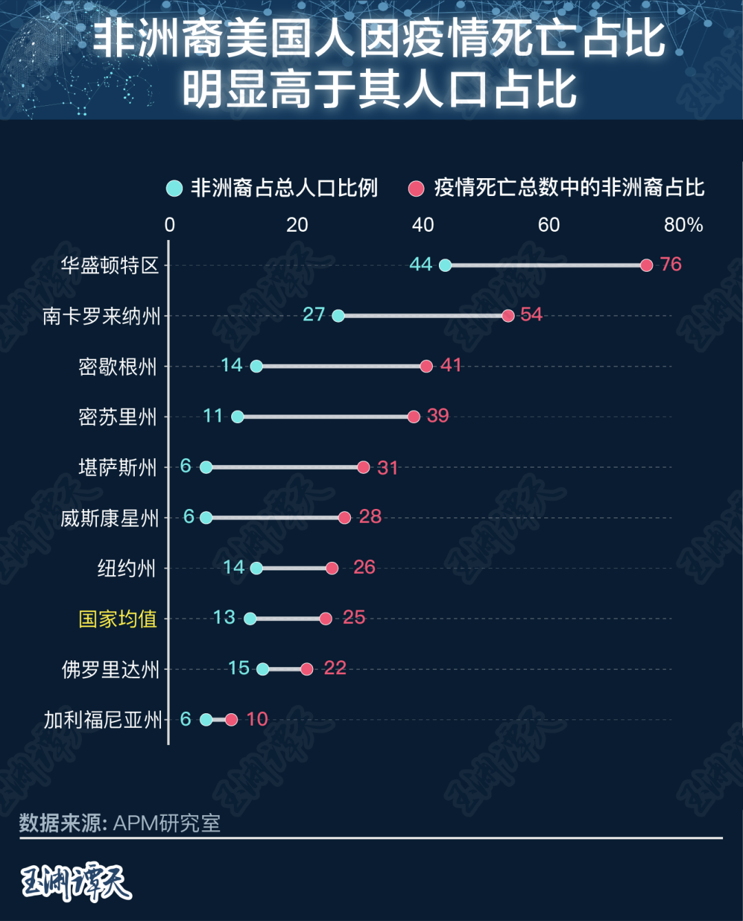 美国研究机构APM的最新数据显示:疫情期间,平均每10万名非洲裔美国人当中,有超过50人因感染病毒死亡,而白人平均20人死亡,不足前者的一半。