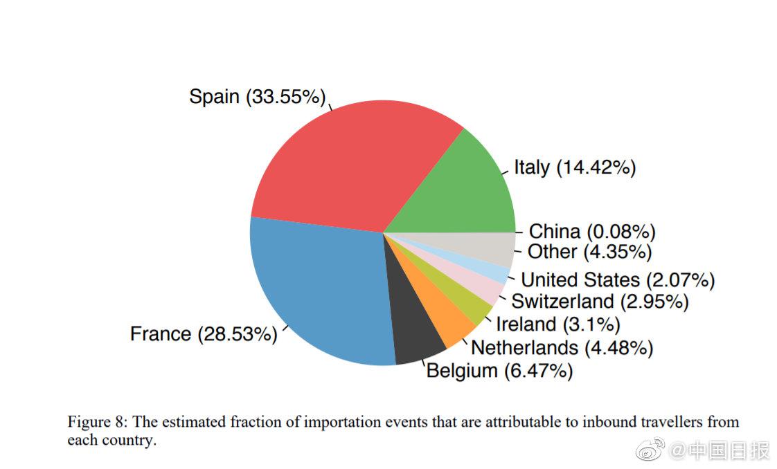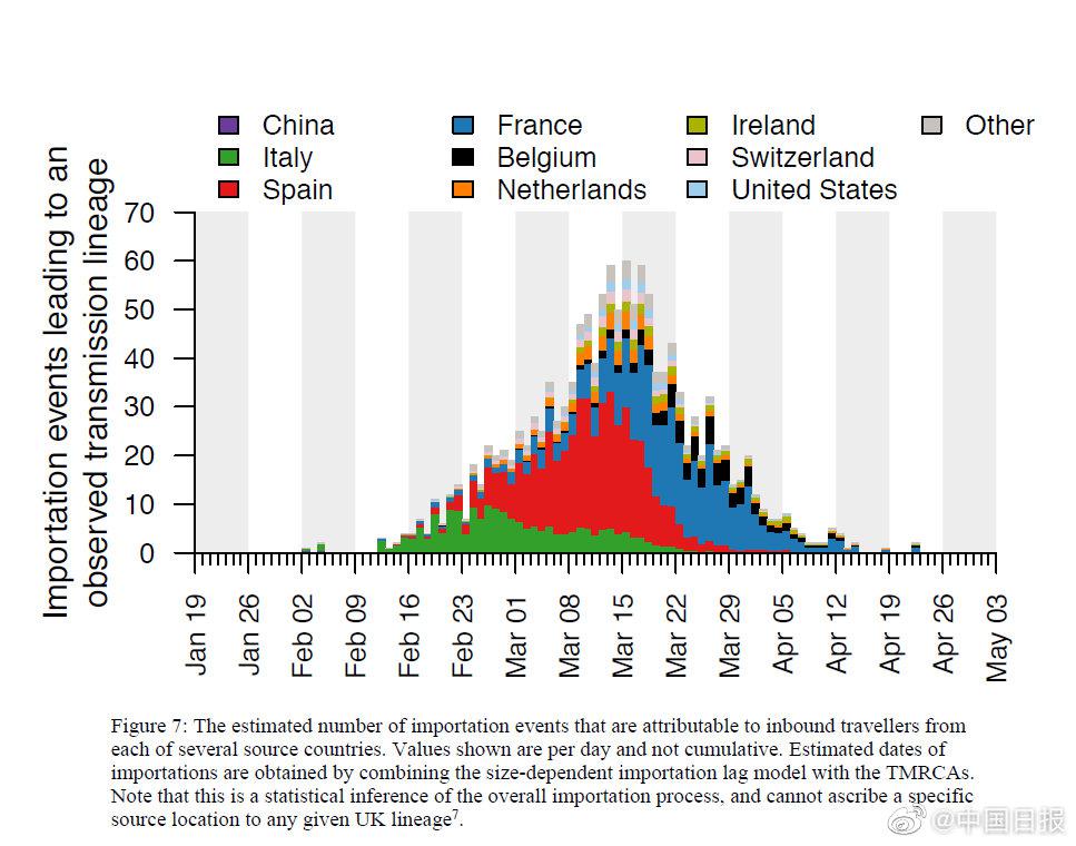 近日,英国牛津大学、英国爱丁堡大学和学术研究联合组织Cog-UK联合发布报告,称通过对英国境内超过2万多例新冠感染者携带的病毒进行基因测序,发现至少1356条独立的新冠病毒传播链条。对这些传播链条进行溯源后,发现超过三分之一(34%)最初源头来自西班牙,29%来自法国,14%来自意大利,而仅有0.08%来自中国,其影响微不足道。该报告称,早期从中国和亚洲其他地区传入的病例仅占英国所有境外传入病例的“极小”一部分。(记者 陈靖怡)