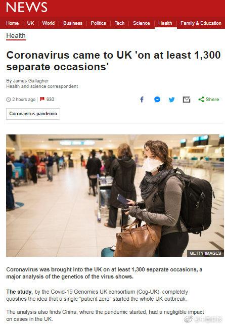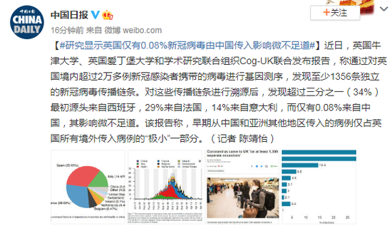 原标题:研究显示英国仅有0.08%新冠病毒由中国传入影响微不足道