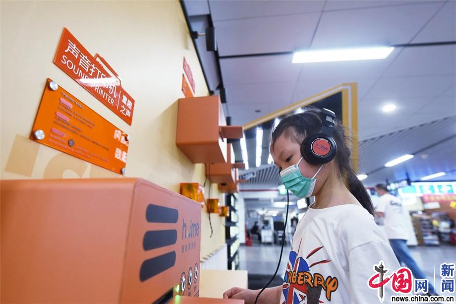 2020年6月15日,小乘客和家长在杭州一地铁站体验“声音打印机” 。近日,几台“声音打印机”出现在杭州一地铁站中,人们只需在“声音打印机”边上戴上耳机,聆听一段声音的奇妙之旅后,就会有一张封印着“声音”的明信片被打印出来送给体验者。