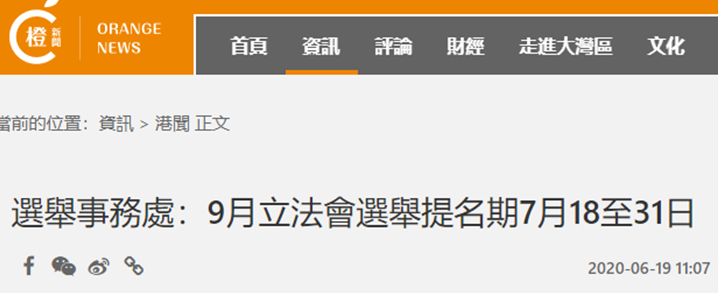 香港立法会换届选举9月6日举行,由地方选区和功能界别各选出35名议员,共选出70名议员。选举事务处今日(19日)公布,换届选举的提名期由7月18日开始,至7月31日结束。