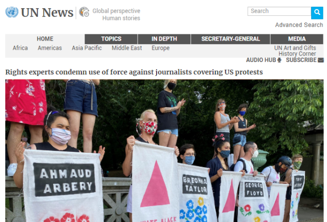 非洲裔男子“弗洛伊德之死”引发的怒火席卷全美,多位记者在报道抗议活动时,遭到警方的骚扰、逮捕,以及非致命武器的袭击,其中包括外国记者。联合国新闻网站6月10日报道,联合国特别报告员大卫·凯表示,过去两周,联合国收到了多起报道和平抗议行动的新闻记者被美国警方袭击、骚扰、逮捕和拘留的投诉。大卫·凯表示,新闻工作者是民主社会的“监督人”,执法机构有责任确保新闻工作者的人身安全,并保证公众的知情权。