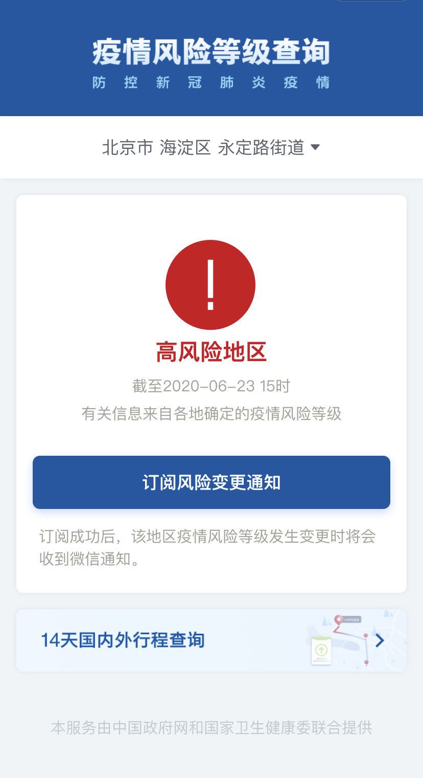 北京海淀区永定路街道疫情风险等级调整为高风险地区