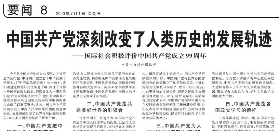 今年是中国共产党成立99周年。习近平总书记指出,中国共产党立志于中华民族千秋伟业,百年恰是风华正茂!七一前夕,我们通过党的对外交往渠道了解、梳理了世界一些国家的政党政要、智库媒体人士等对我们党99年发展的认识评价,他们对中国共产党成立以来所走过的光辉历程和取得的伟大成就予以高度赞扬,认为中国共产党不仅深刻改变了中国人民和中华民族的前途和命运,而且深刻改变了世界发展的趋势和格局,为人类文明进步作出了巨大贡献。