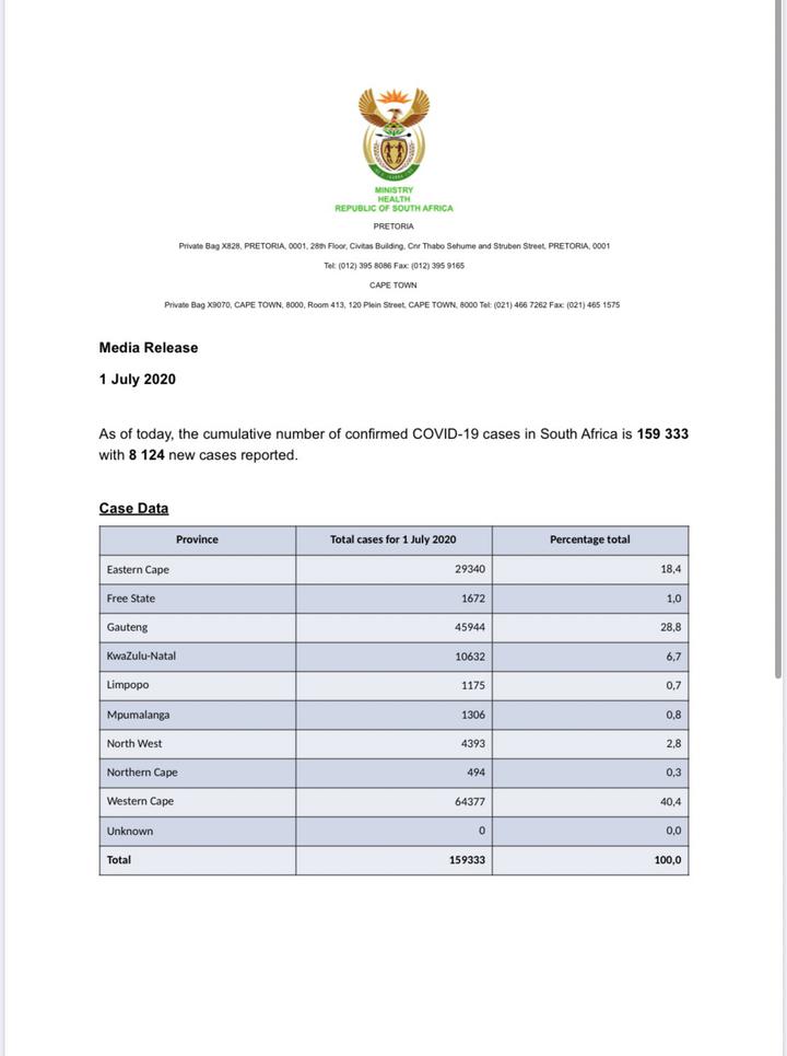 7月1日南非卫生部确认南非当天新增新冠肺炎确诊病例8124例,累计确诊159333人,南非全国已检测1666939人,当日检测36931人。