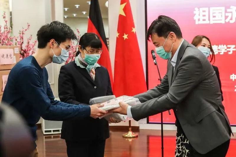 德国疫情暴发后,驻德使馆教育处在第一时间建立了与各地学联的紧急联络机制;组织建立了110多个留学人员抗疫微信工作群,吸纳了近4万名留德学子;先后将两批共7500份“健康包”及时高效发放至在德留学人员手中,给他们送去了温暖和爱心,进一步坚定了他们留守德国的信心和决心。