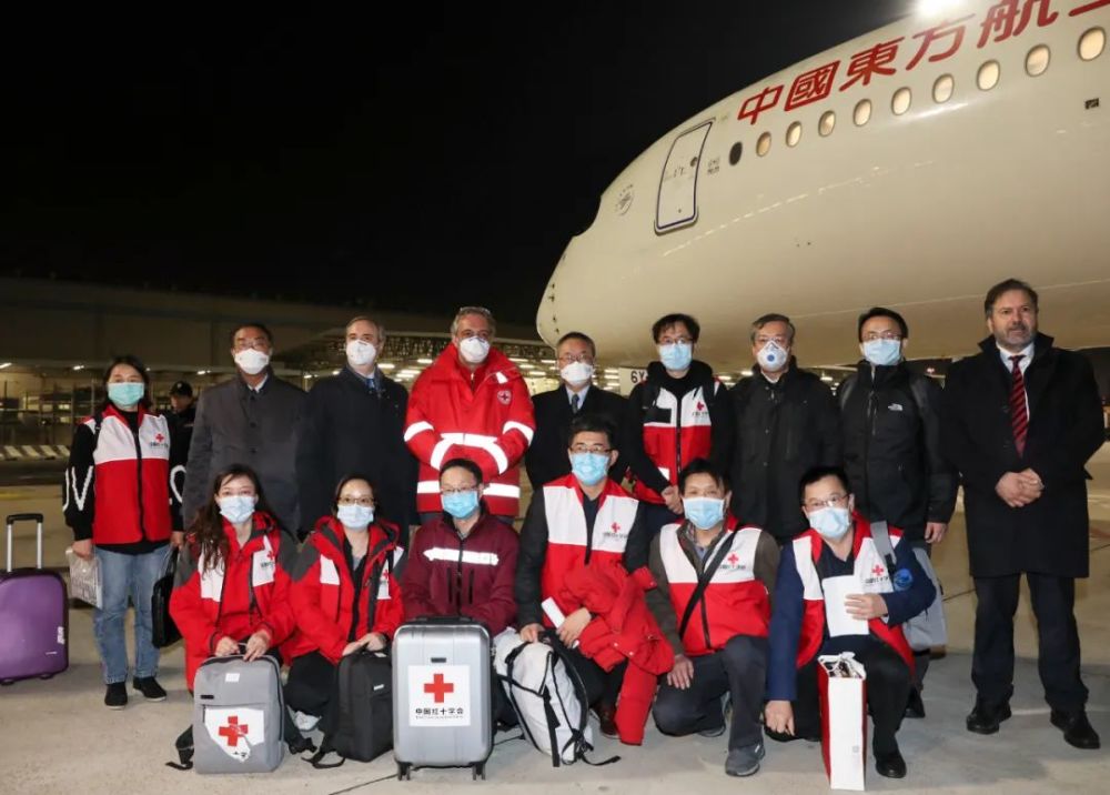 3月12日,在意大利首都罗马,意大利红十字会主席罗卡(后排右六)与中国抗疫医疗专家组一行9人合影。