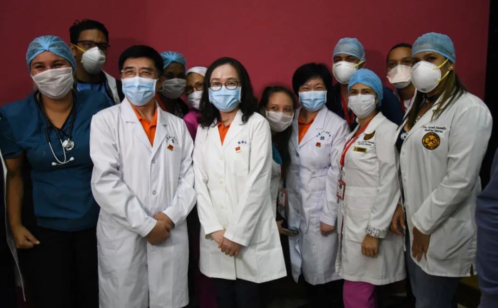 4月7日,在委内瑞拉加拉加斯何塞·耶雷娜医院,中国援助委内瑞拉抗疫医疗专家组成员与当地医生交流经验后合影。新华社发(萨尔戈多摄)