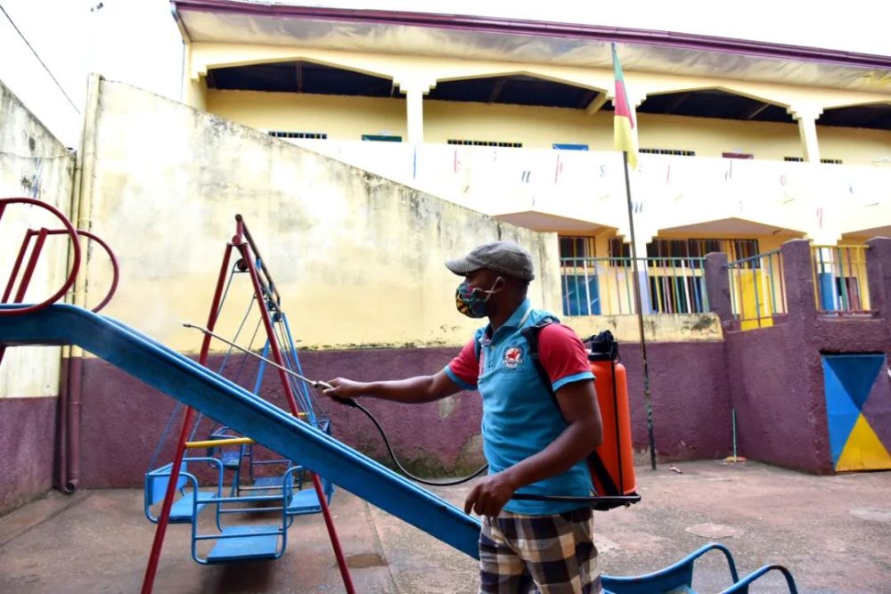 5月29日,一名教职工在喀麦隆首都雅温得即将复课学校内进行消杀作业。新华社发