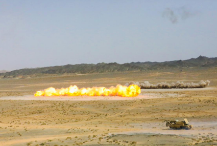 演练开始,炮兵分队迅速从集结地域机动至预设炮阵地,根据侦察所得数据向“敌”炮阵地开火。炮兵打击过后,火箭炮阵地补充火力进行打击,火箭弹呼啸而出,对“敌”阵地进行火力覆盖。坦克、步战车等装甲分队向预定点发起冲击。工兵破障车开辟通路,为后续分队冲击提供通路保障。