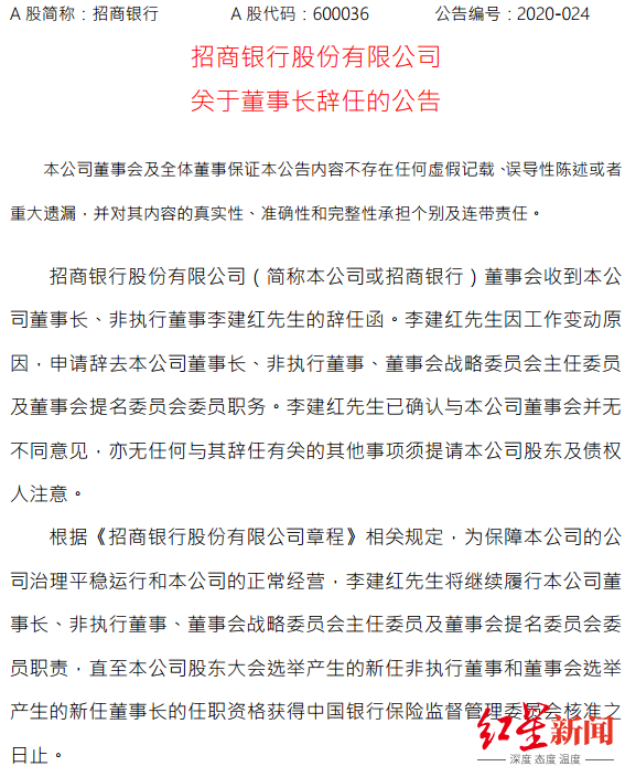 招商银行表示,为保障公司的平稳运行和正常经营,李建红将继续履行董事长、非执行董事、董事会战略委员会主任委员及董事会提名委员会委员职责,直至股东大会选举产生新的非执行董事和董事会选举产生的新任董事长资格获得银保监会核准之日止。