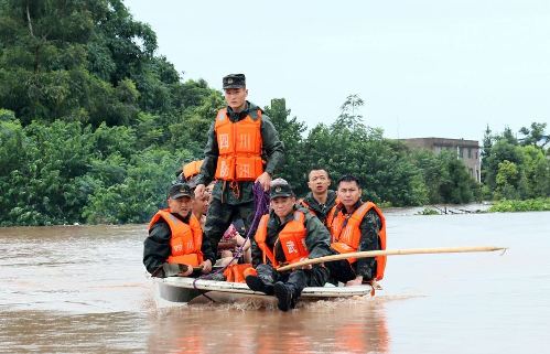 武警乐山支队官兵携带救援器材,赶赴乐山市中区绿心街道罗李坝村实施救援。何伟俊 摄