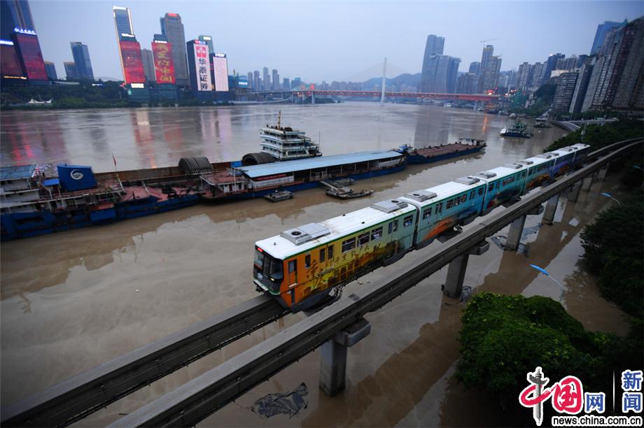 受四川盆地强降雨影响,重庆市嘉陵江流域出现第2号洪水、长江流域出现第5号洪水。8月19日,洪水漫上嘉滨路大溪沟、黄花园到洪崖洞路段,重庆单轨2号线和江面上的轮船一样,行驶在“水上”,成为重庆洪峰浪尖的又一魔幻景观。小顺/IC photo